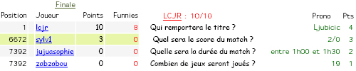 | Retour | Accueil | Photos | Montages | Tennis | Musik | Blagues | Défis Pronos | Liens | Pages Spéciales | |||||||||||||||||||||||||||||||||||||||||||